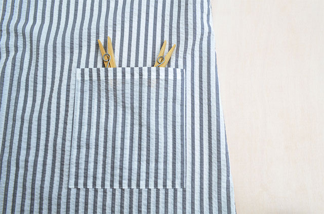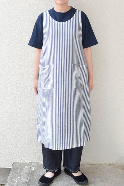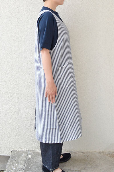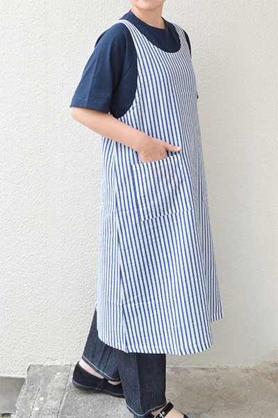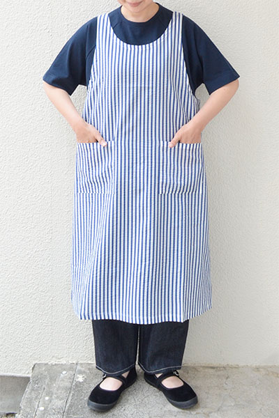 爽やかなストライプ柄をプリントした薄手の80ローンに塩縮加工を施した生地のエプロン。