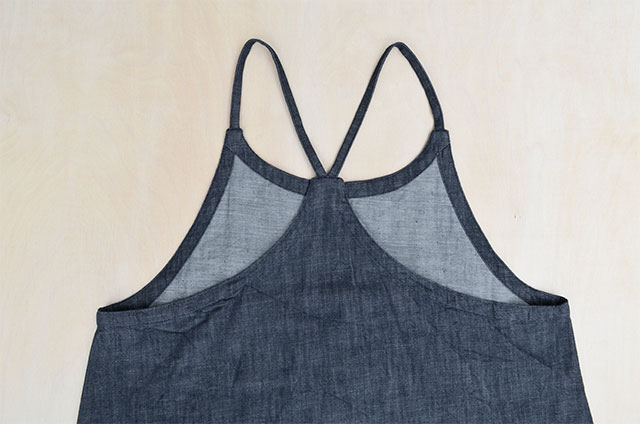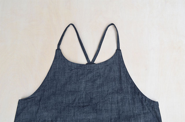 しっかりした6.5オンスのデニムでつくった、ロング丈のキャミソールエプロンです。