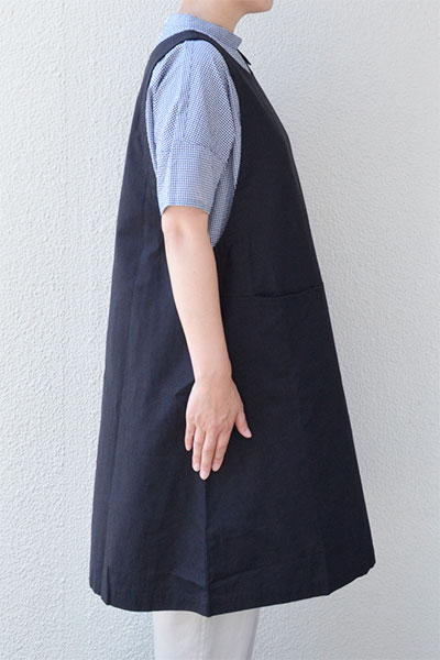 オーバーエプロンは飽きのこないシンプルなデザインで、