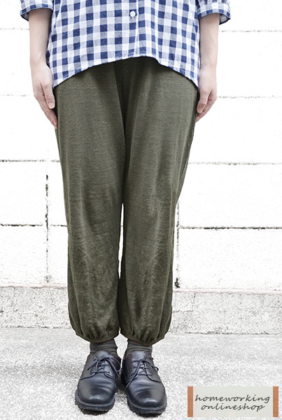 裾のギャザーがふんわりとしていて、とても可愛いです。リネンの生地がしっかりとしていて、落ち感もあります。腰周りもゆったりしているので、とても履きやすいアンダーパンツです。