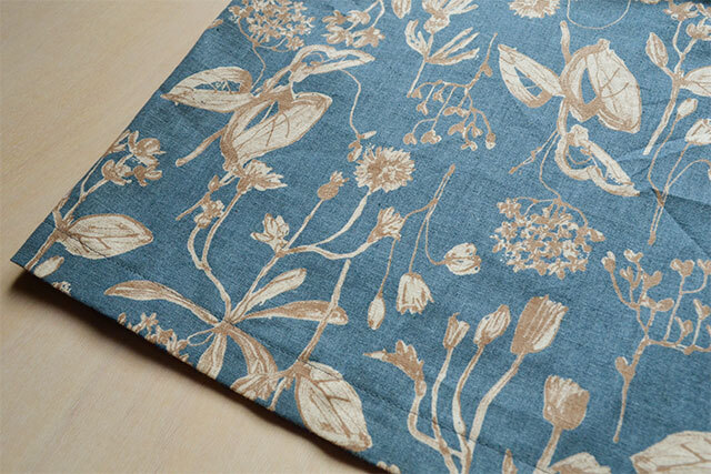 ▲ラフスケッチのようなタッチで描かれた草花柄。生成地にブルーのプリントをしています。